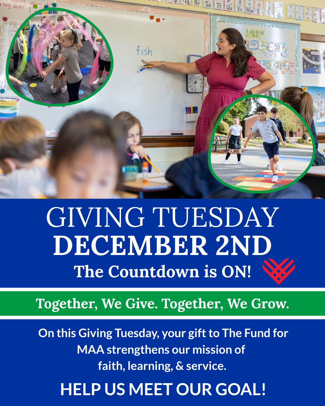 Giving Tuesday Giving Tuesday is just around the corner! On Tuesday, December 2nd, we’ll join schools and nonprofits around the world to celebrate generosity and community. This year, gifts to the Fund for MAA support the portion of expenses that tuition alone does not cover. Your gift will help support: Faculty salaries, benefits & professional development Investments in enhanced classroom environments, safety upgrades, and IT infrastructure Campus Enhancements & Maintenance Mark your calendar and help us make a difference for our students! Click the links below to donate: Donate Online Donate via Venmo Donate via PayPal