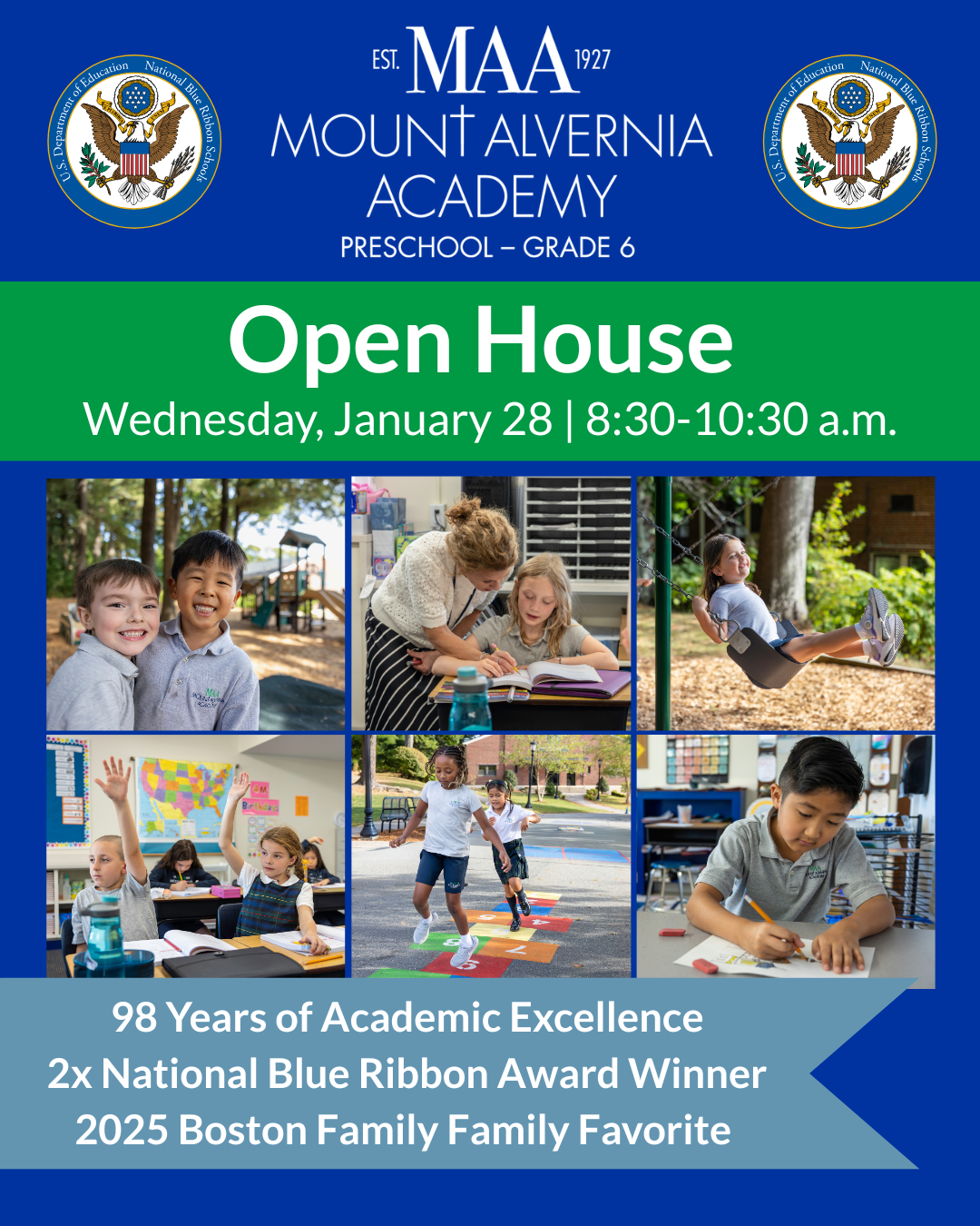 You're Invited to MAA's January Open House MAA invites you to visit our campus for an Open House on January 28 from 8:30–10:30 AM. As a two-time National Blue Ribbon School with a rich history spanning 98 years, we are proud to offer a tradition of academic excellence in a nurturing and supportive environment. Join us for an opportunity to tour our four-acre campus, meet our faculty and staff, and explore the blue ribbon difference. Register for our Open House HERE