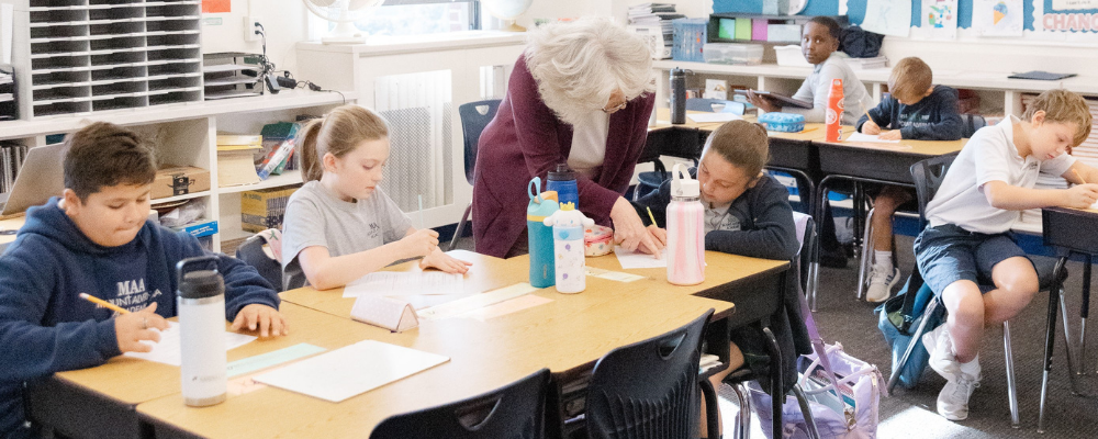 Grammar is learned both in isolation and in application as the students use what is taught in all writing projects. Using process writing, the students write regularly. They begin with their first major research piece on a saint, which is then presented at the All Saints' Day liturgy, availing them the opportunity to practice their public speaking skills.